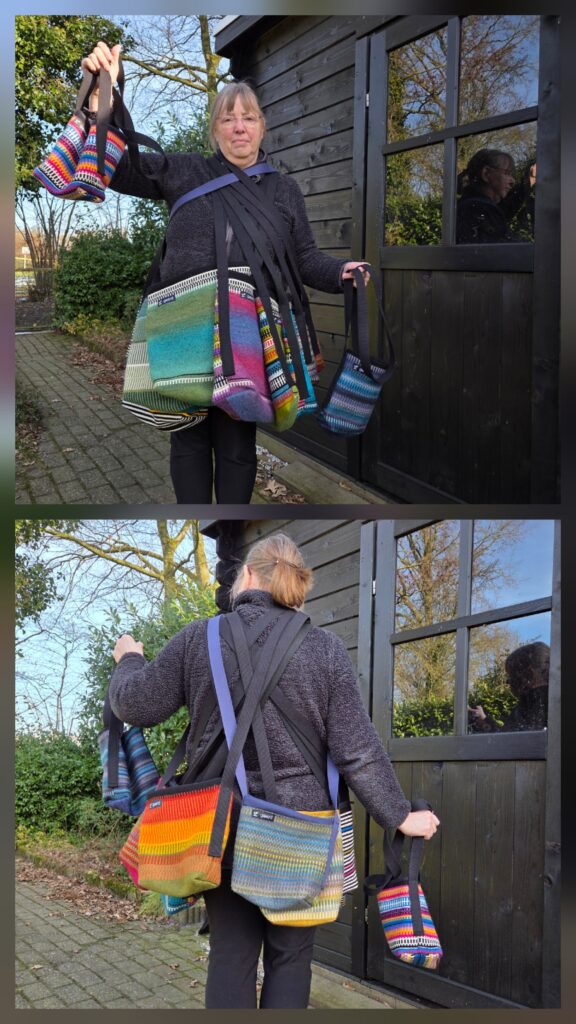 Als je voor het eerst naar een beurs, of zoals deze eerste keer, een fair gaat, moet je natuurlijk wel iets kunnen laten zien en vertellen wat je zoal maakt, hoe je dat hebt gedaan, welke materialen er zijn gebruikt, welke voor- en nabehandelingen zijn toegepast en welke wasvoorschriften er gelden. En natuurlijk is ook belangrijk dat je voldoende voorraad hebt om belangstellenden die eventueel iets willen aanschaffen, van dienst kunt zijn. De foto hierboven toont de voorraad keukentextiel (hand- en theedoeken). De foto hieronder de weefster omringd met de tassen die de afgelopen weken gereed zijn gekomen. In de galerij is te zien welke exemplaren beschikbaar zijn. Veel kijkplezier!