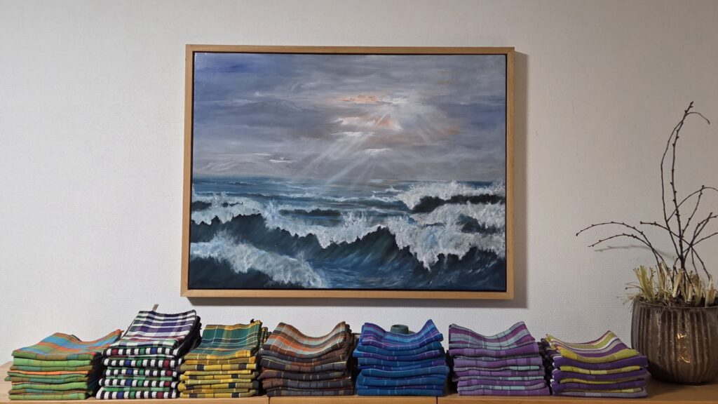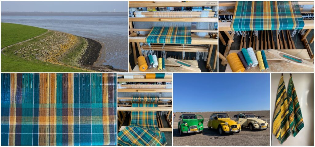 Wat hebben de kust en oldtimers met elkaar gemeen? De kleuren en de inspiratie voor het ontwerp van een fraaie set keukentextiel. De foto linksboven is gemaakt op de dijk bij Termunten in de provincie Groningen, de foto van de Eendjes bij Stellendam in de provincie Zeeland. Toeval, je gaat het pas zien als je het door hebt!