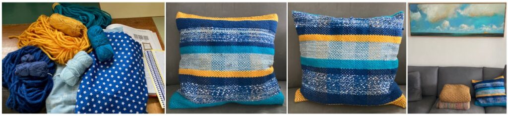 Wie heeft ze niet? Restanten stof uit een ver verleden die je nog ergens hebt liggen, restanten dunne garens van een breiproject met achteraf bezien precies de goede kleur en geschiktheid voor de ketting en ook nog een paar strengen dik Smyrnagaren die in retroperspectief een miskoop voor een gepland breiwerk bleken te zijn. Tijdens een inleidende cursus weven waarin we leerden ‘voddenweven’ ontstond het idee om de materialen te verweven tot een comfortabel kussen dat bovendien precies past bij het schilderij van onze achternicht, Dinie Boogaart.