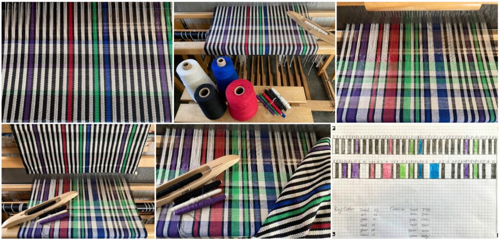 Gewoonlijk gaat het ontwerp vooraf aan het maken van een weefwerkstuk. Dit keer ging het anders(om). De foto linksboven is ontstaan als handdoek om te gebruiken in onze witte sanitaire ruimten. Toen het werkstuk goed en wel zichtbaar werd op het weefgetouw realiseerde ik me dat het ook goed zou staan in onze keuken, maar dat er dan wel een bijpassende theedoek naast zou moeten hangen. Passend is in dit geval niet hetzelfde als identiek. De bovenste rij op de ontwerptekening is de weergave van het patroon van de handdoeken zoals dat was ‘ontstaan’ op het weefgetouw. De onderste rij toont het aanvullende ontwerp van de theedoeken. De beide foto’s linksonder laten de combinatie van beide werkstukken zien. De materialen en de kleurnummers zijn ‘bij de hand’.