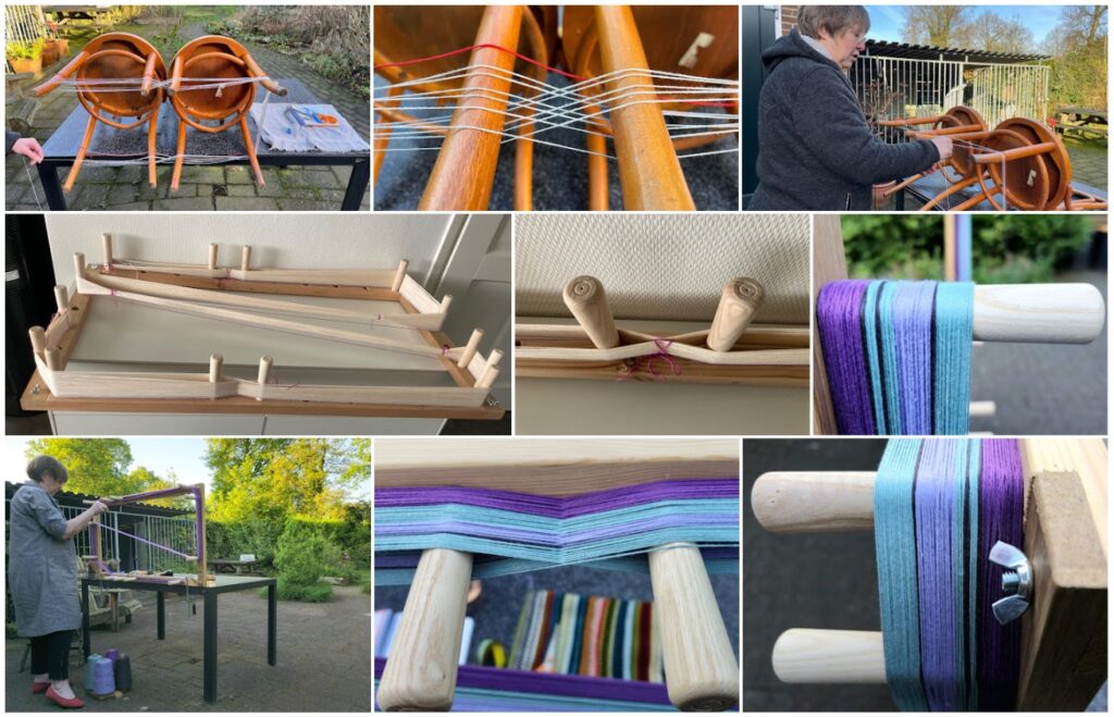 Alle weefsters en wevers kennen de absoluut noodzakelijke stap van het scheren van kettingdraden en de techniek daarachter. Er zijn ook hele handige scheerramen voor verkrijgbaar. Maar wat doe je als beginnend weefster als je nog niet over zo’n handig hulpmiddel beschikt, maar je toch alvast aan de slag wilt, omdat zogezegd, je vingers spreekwoordelijk jeuken? Welnu, dan neem je twee oude ‘Thonet’ No.14 stoelen. Je legt ze op hun kant, net ver genoeg uit elkaar, en scheert de draden over de gladde, want gelakte poten. Wel even opletten dat er een enkelvoudig kruis ontstaat, anders wordt het een warboel. Scheren kun je improviseren!